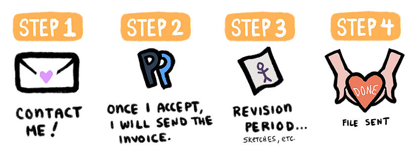 If you're interested in commissioning me or have any questions feel free to contact me at skullcrabsart@gmail.com and I will try to get back to you as soon as possible! Feel free to link me to any of my previous work if you're interested in a certain "vibe" or style.The process will be the following,